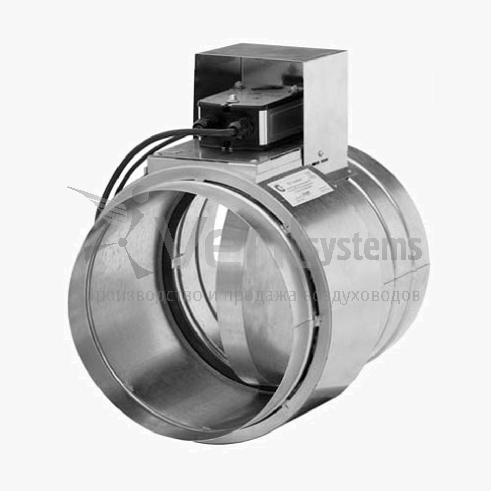 Корпус клапана исполнен из прочной оцинкованной стали. Заслонка дополнительно обрабатывается специальным огнестойким материалом. Изделие оснащено электромеханическим приводом. Данное изделие предназначено для установки в круглых вентиляционных каналах.