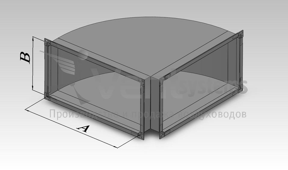 Отводы производятся из оцинкованной стали определенной толщины. Прямоугольное изделие собирается из четырех основных элементов: двух боковых стенок, а также внешней и внутренней сторон. На края отвода устанавливаются фланцы. Стандартные варианты угла поворота включают значения от 15 до 90 градусов.